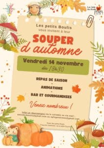 Souper d’automneLe vendredi 14 novembre, notre traditionnel souper d’automne est de retour pour une soirée conviviale et gourmande. Nous espérons vous y voir nombreux.ses ! Partages cette actu avec tes amis ! FacebookXWhatsAppEmail